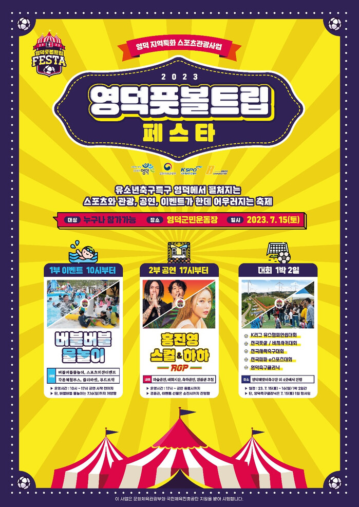 15일 17시부터는 “2023 영덕풋볼트립 페스타”의 개막을 축하하기 위해 마술팀 Magic Q, 가수 홍진영과 스컬&하하의 공연이 펼쳐지며 본 행사의 열기를 더해 줄 것이다.