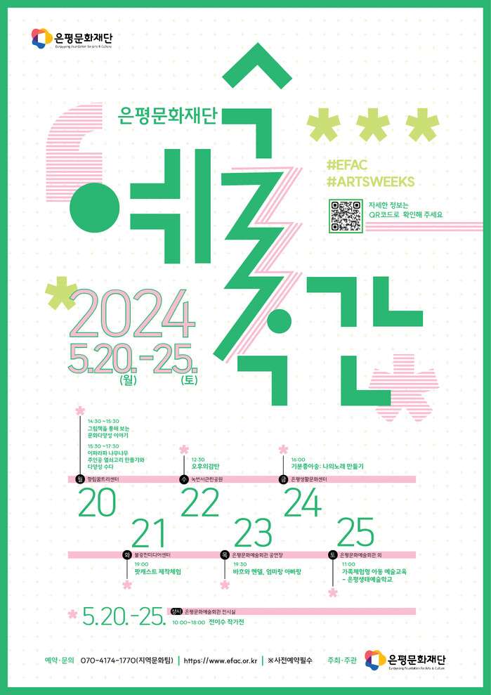 사업 관계자는 “올해 처음 선보이는 ‘은평문화재단 예술주간’을 통해 재단에서 운영하고 있는 공연, 전시, 교육 등 여러 문화예술 사업을 알리고, 참여자들 또한 예술을 직접 경험하며 예술로 일상을 누리는 특별한 일주일이 되길 기대한다.”고 전했다.