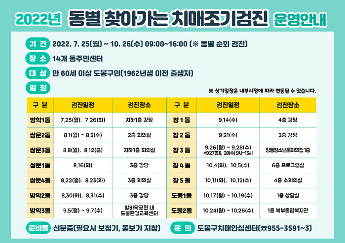 [시민일보 = 박준우 기자] 서울 도봉구(구청장 오언석) 치매안심센터는 오는 25일부터 '동병 찾아가는 치매 조기검진'을 실시한다.