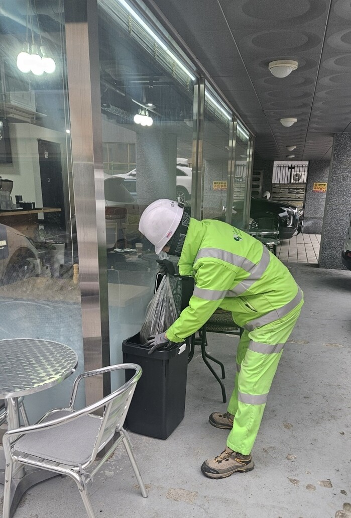 | ▲ 마포구 환경공무관이 지역내 커피전문점에 방문해 커피박을 수거하고 있다. (사진=마포구청 제공) |