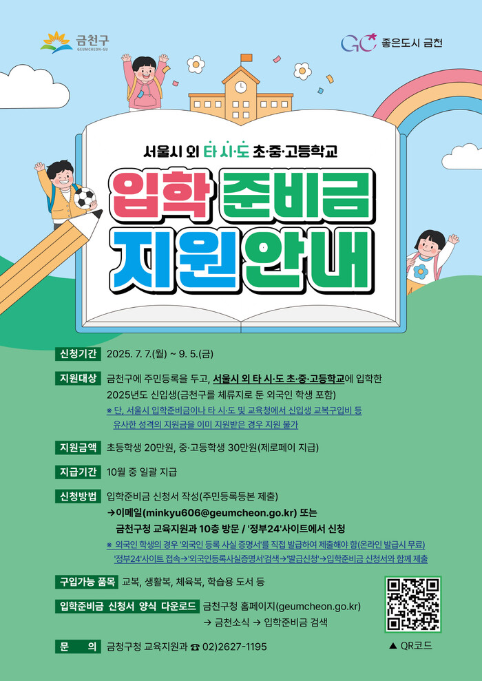 [시민일보 = 여영준 기자] 금천구(구청장 유성훈)는 서울시 외 타 시·도에 위치한 초·중·고등학교에 입학한 금천구 신입생을 대상으로 ‘입학준비금 지원사업’을 시행한다고 25일 밝혔다.