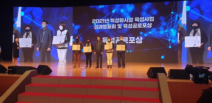 | ▲ ‘2021년 전국우수시장박람회’에서 시 관계자들이 중소벤처기업부 장관상을 수상한 후 기념촬영을 하는 모습. (사진제공=오산시청) |