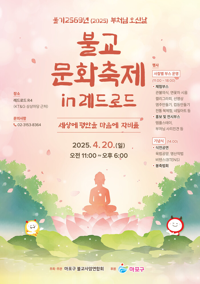 [시민일보 = 문민호 기자] 마포구(구청장 박강수)가 후원하고 마포구 불교사암연합회가 주관하는 ‘불교문화축제 in(인) 레드로드’가 오는 20일 오전 11시부터 오후 6시까지 레드로드 알(R)4에서 열린다.