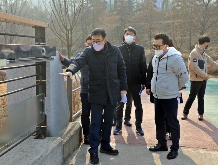 경기 수원시 권선구는 최근 호매실천 목교 설치 현장과 물향기공원 자전거 횡단교 보수 및 도색 등 사업 예정지 및 고색역 주변 융·복합 개발사업, 인근 도로개선 사업 현장 등 호매실동과 평동 주요 사업현장 4곳을 방문해 사업 추진현황을 살폈다. 사진은 이날 이귀만 구청장(왼쪽)이 현장 점검을 하고 있는 모습. (사진제공=권선구청)