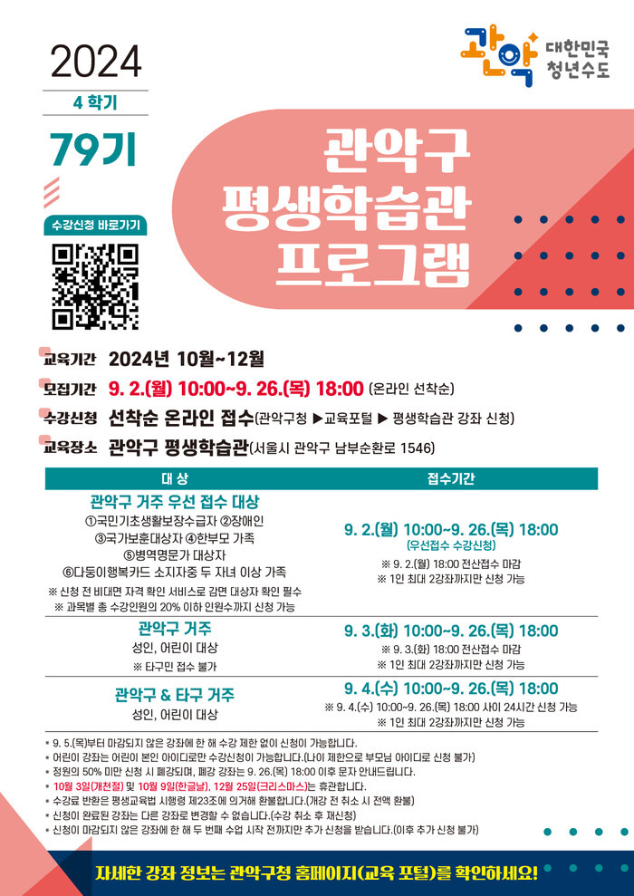 [시민일보 = 여영준 기자] 서울 관악구(구청장 박준희)가 배움의 열정을 이어나갈 2024년 4학기 평생학습관 교육 문화강좌 수강생을 모집한다.