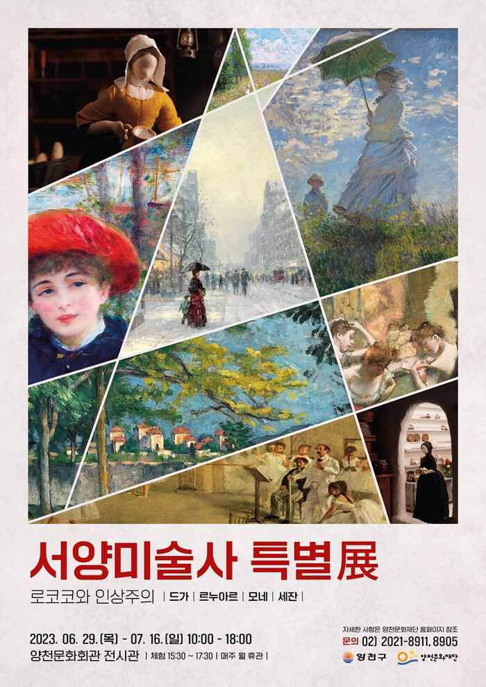 [시민일보 = 이대우 기자] 서울 양천구(구청장 이기재)는 오는 16일까지 양천문화회관 전시관에서 드가, 르누아르, 모네, 세잔의 대표작품 30점을 모작(레플리카)으로 선보이는 ‘서양미술사 특별전 – 로코코와 인상주의 展’을 개최한다고 밝혔다.