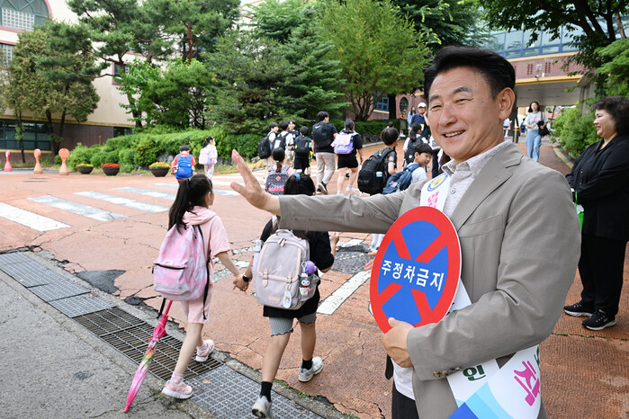 경기 의정부시가 16일 오전 등교시간에 새말초등학교 정문 앞 어린이 보호구역(스쿨존) 일대에서 교통안전 캠페인을 전개했다. 캠페인에는 김동근 시장을 비롯해 녹색어머니연합회, 한국 교통안전공단 경기북부본부 등 50여명이 참여했다. 사진은 김 시장이 캠페인에 참여하는 모습. (사진=의정부시청 제공)
