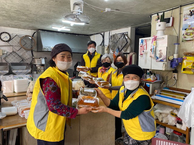 충남 아산시 영인면 행복키움추진단과 장재울식당이 9일 지역내 저소득 가정에 밑반찬을 지원했다. 사진은 이날 장재울식당 곽종학 대표와 봉사자들이 밑반찬을 포장하고 있는 모습. (사진제공=아산시청)