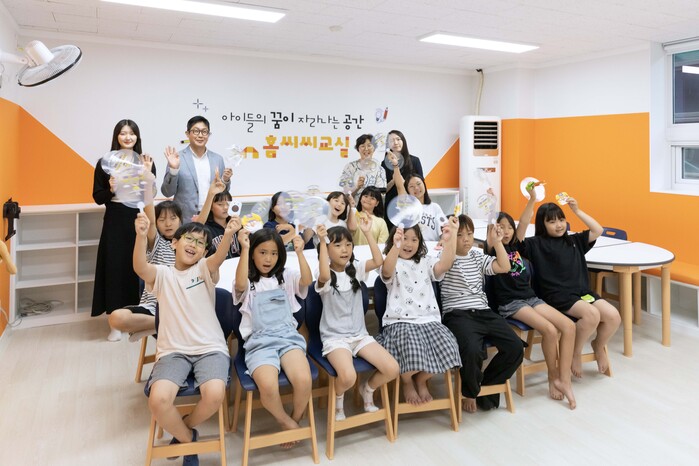 | ▲ 홈씨씨교실 6호점 개소를 기념해 아동들과 관계자들이 기념촬영을 하고 있다. (사진=KCC글라스 제공) |