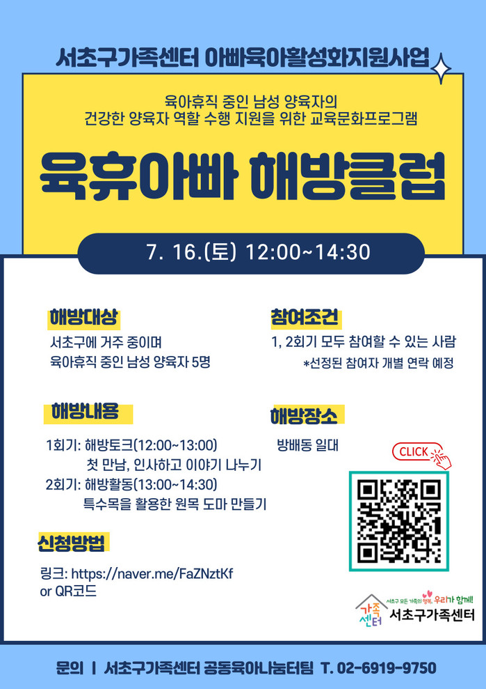 [시민일보 = 이대우 기자] 서울 서초구 가족센터는 오는 16일 토요일 낮 12시~오후 3시 방배동 일대에서 서초구 내 육아휴직 남성 양육자를 위한 힐링 프로그램인 ‘육휴아빠 해방클럽’을 실시한다.