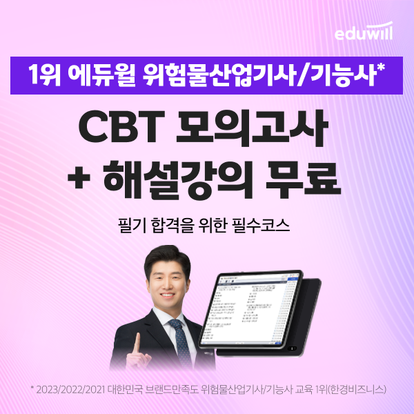 ‘에듀윌 위험물산업기사 CBT 모의고사’는 에듀윌 회원이라면 누구나 무료로 응시할 수 있으며, 신청일로부터 3일간 해설 강의를 수강할 수 있다.
