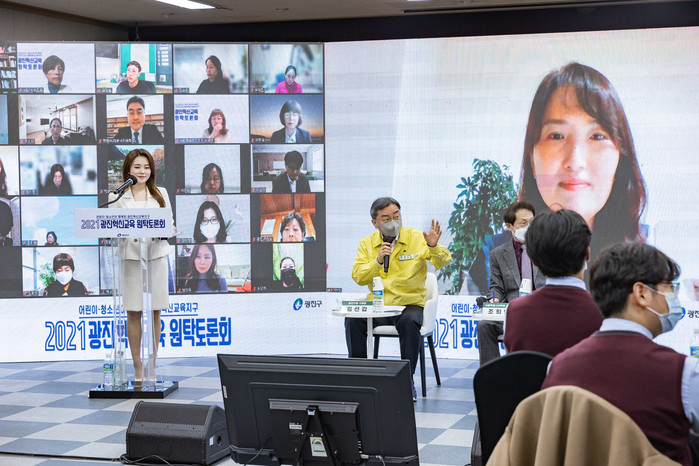 광진구는 지난 9일 ‘2021 광진혁신교육 원탁토론회’를 열었다. 이날 토론회는 ▲청소년 자치활동지원 ▲마을교육 공동체 육성 지원 ▲혁신교육사업 참여 활성화 방안 ▲지역특화 사업 4가지 주제로 진행됐으며, 참석자들은 토론이 끝난 후 김선갑 구청장, 조희연 서울시교육감과 질의 응답시간을 보냈다. 사진은 토론회에 참석한 김 구청장(왼쪽에서 두 번째)이 발언을 하고 있는 모습. (사진제공=광진구청)