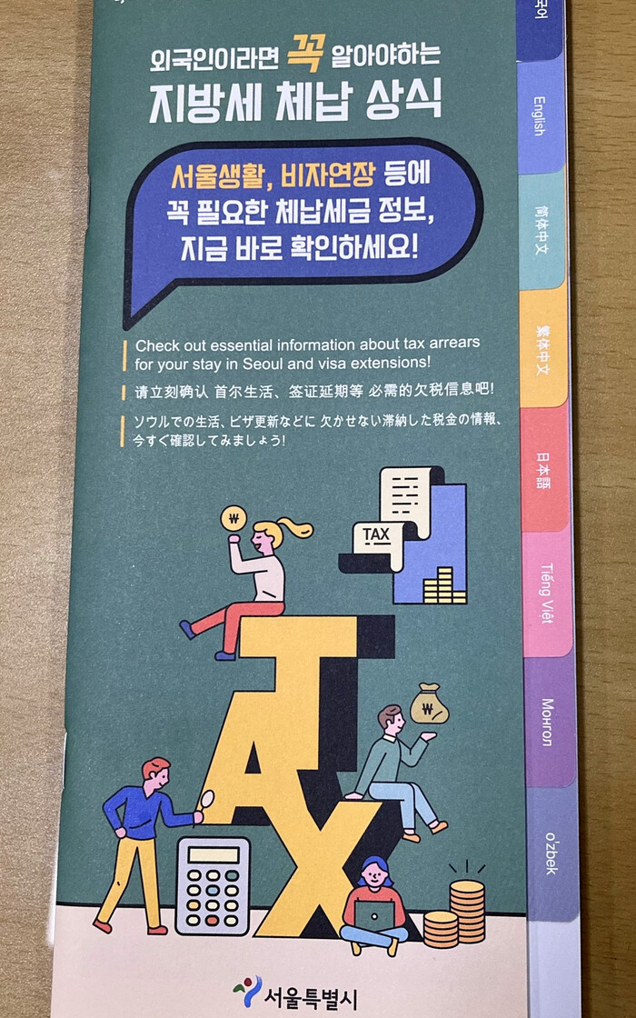 아울러 8개 언어로 제작된 ‘외국인이라면 꼭 알아야 하는 지방세 체납 상식’ 리플릿(사진)을 외국인과의 접점이 많은 관내 동주민센터와 대학교 등에 비치해 지방세 납세 의식을 높인다.
