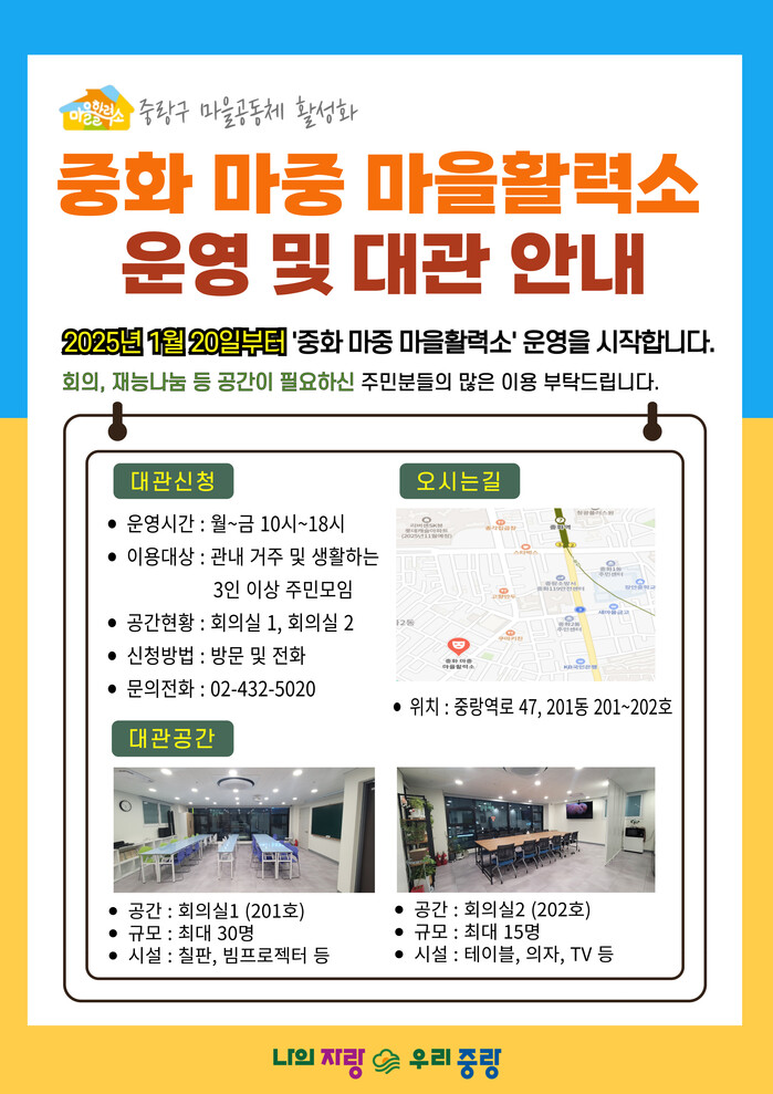 구는 현재 ▲망우 마중 마을활력소(용마산로 461) ▲사가정 마중 마을활력소(면목로45길 3-2) ▲겸재 마중 마을활력소(겸재로 68) ▲중화 마중 마을활력소(중랑역로47 201~202호) 총 4곳에서 주민들에게 공간을 제공하고 있다.