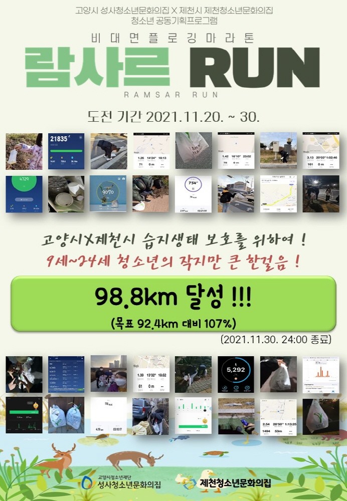 ‘람사르 RUN’은 '고양시-제천시 메타버스 활용 청소년 교류 프로그램'을 통해 모인 제천시와 고양시의 청소년 대표단이 직접 기획·운영한 프로젝트 사업으로, 고양시-제천시 공동과제인 습지생태 보전을 주제로 쓰레기를 주우며 달리기를 하는 신(新) 문화활동 ‘플로깅’을 접목한 ‘비대면 플로깅 마라톤’ 형식으로 진행되었다.