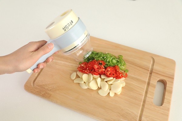 한편, 일초컷 전동 채칼 다지기는 버튼 하나로 채칼과 다지기 두가지 기능이 가능한 핸디형 무선 전동채칼이다.