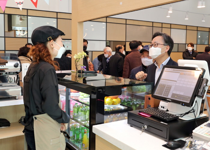 서울 금천구 출자기관인 금천일자리주식회사가 최근 가산데이터허브센터 1층에 카페 ‘카페인(CAFE_INN)’을 개업했다. 카페인은 경력단절 여성·청년 등 지역내 취업 취약계층의 일자리 창출을 목표로 하고 있다. 사진은 지난 7일 유성훈 구청장(오른쪽)이 카페인을 찾아 직원과 이야기를 나누고 있는 모습. (사진제공=금천구청)
