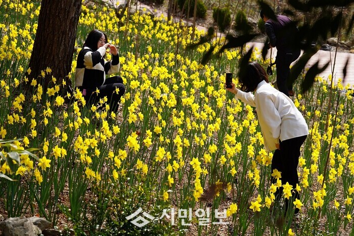 봄맞이 관람객들을 위해 식재 한 14종, 4만 여 본의 수선화가 이번 주부터 만개해 수목원 곳곳을 노란빛으로 물들이고 있다.