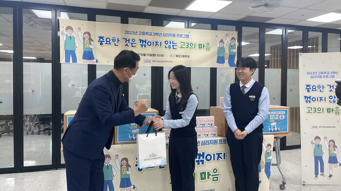 [시민일보 = 홍덕표 기자] 서울 성북구(구청장 이승로)가 최근 계성고등학교에서 대학수학능력 시험을 앞둔 학생과 취업을 준비하는 고등학교 3학년 학생을 응원하기 위해 심리지원키트 전달식을 진행했다.