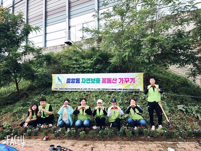 | ▲ 중앙동 자연보호 꽃동산 가꾸기 사업에 참여한 관계자들이 기념 촬영을 하고 있다. (사진=오산시청 제공) |