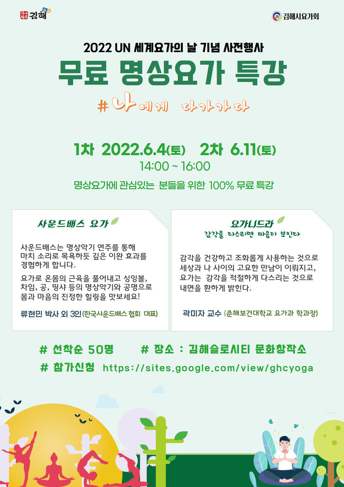 사전행사는 오는 4일과 11일 2회에 걸쳐 생림면 도요리에 위치한 김해슬로시티문화창작소에서 소리명상(사운드배스 요가)과 이완명상(요가니드라)으로 진행된다.