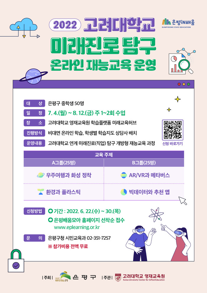 | ▲ ‘2022 고려대 미래진로탐구 온라인 재능교육 운영’ 안내 포스터 (사진제공=은평구청) |