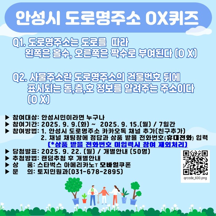 [안성=오왕석 기자] 안성시는 9월 9일(화)부터 9월 15일(월)까지 7일간 ‘도로명주소 OX퀴즈 이벤트’를 진행한다.