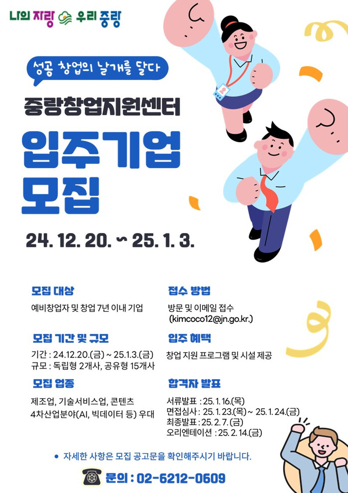[시민일보 = 여영준 기자] 중랑구(구청장 류경기)는 중랑창업지원센터의 새 입주기업을 20일부터 오는 2025년 1월3일까지 모집한다고 19일 밝혔다.