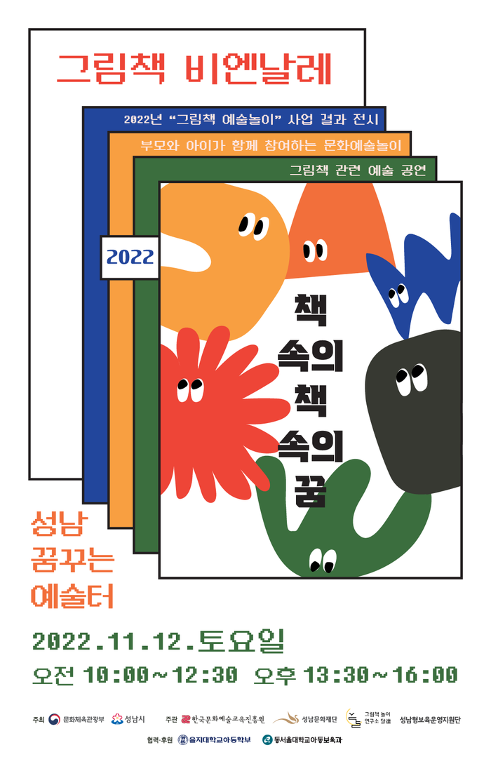 오는 12일(토) 오전 10시부터 성남꿈꾸는예술터(성남문화예술교육센터)에서 진행하는 <2022 그림책 비엔날레>는 올해 진행한 ‘그림책 예술놀이’ 수업 일부를 예술교육가가 직접 선보이는 ‘예술교육가 1일 체험수업’과 어린이집 보육교사들이 준비한 그림책 연계 체험활동 ‘어린이집과 함께하는 체험부스’, 다양한 도구와 재료를 활용해 예술 감각을 깨우는 놀이마당과 공연 등으로 이어진다.