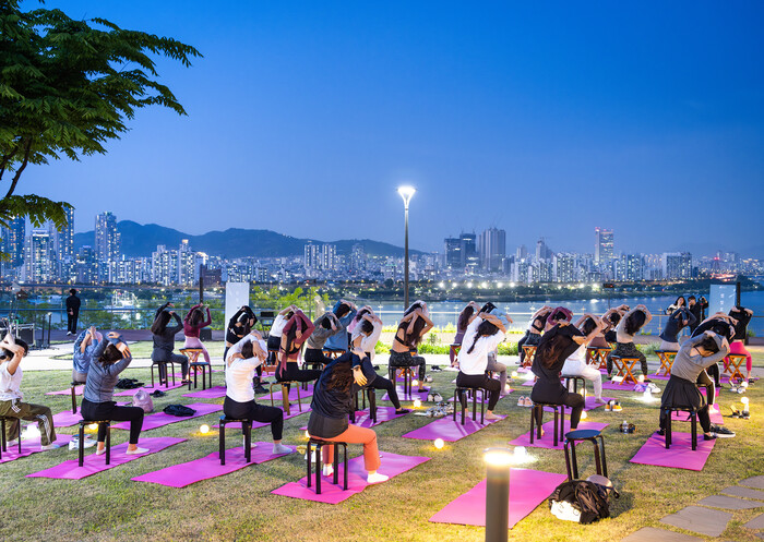 | ▲ 한강뷰를 바라보며 요가하는 사람들. (사진=강남구청 제공) |