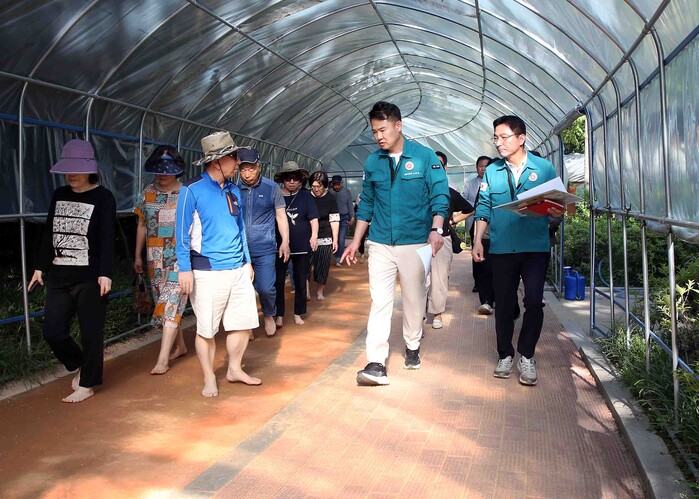오언석 도봉구청장은 최근 ‘구청장의 안전 한바퀴’ 일환으로 맨발 산책로 조성 사업지 초안산근린공원 창골축구장 등 총 3곳의 공사현장을 점검했다. 사진은 오 구청장(가운데)은 방학동 발바닥공원을 찾아 맨발길 운영에 대한 주민 의견을 수렴하고 있는 모습. (사진=도봉구청 제공)