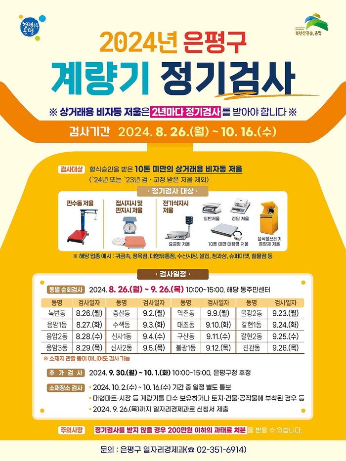 [시민일보 = 이대우 기자] 은평구(구청장 김미경)가 오는 26일~10월16일 지역내 상점들을 대상으로 ‘2024년 계량기 정기검사’를 실시한다.