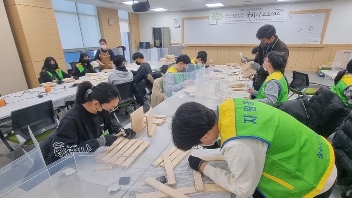 경기 광주시 청소년자원봉사단 ‘누리보듬’은 최근 청소년활동 프로그램 ‘굿바이 스트레스’를 진행했다. 이날 단원들은 목공예를 통해 제작한 25개의 독서대를 지역내 소외계층 청소년들에게 전달했다. 사진은 청소년들이 목공예로 독서대를 만들고 있는 모습. (사진제공=광주시청)