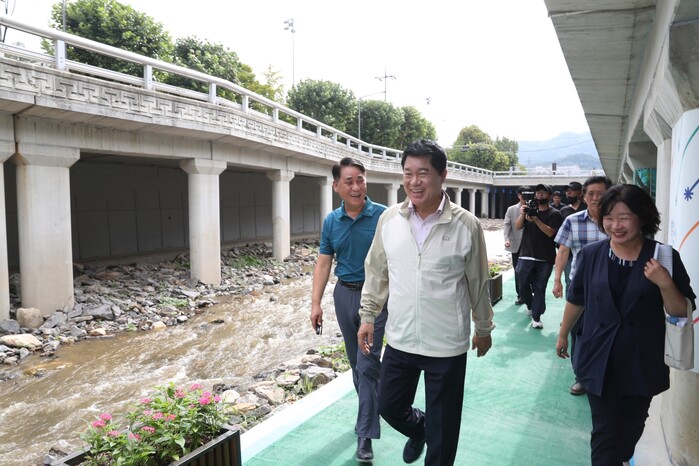 | ▲ 생태하천으로 복구된 별빛내린천을 박준희 구청장과 관계자들이 살펴보고 있다. (사진=관악구청 제공) |
