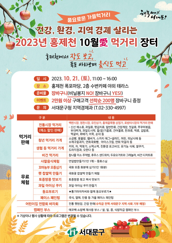 [시민일보 = 홍덕표 기자] 서대문구(구청장 이성헌)가 오는 21일 홍제천 수변 카페 야외 테라스(2층)와 폭포마당(1층)에서 '10월愛 먹거리 장터'를 개최한다.