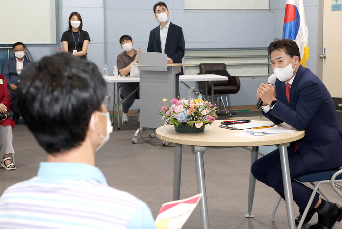 | ▲ 2022년 7월 창1동을 방문한 오언석 구청장(오른쪽)이 주민들과 대화를 나누고 있는 모습. (사진=도봉구청 제공) |