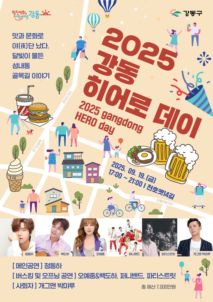 [시민일보 = 이대우 기자] 강동구(구청장 이수희)가 오는 19일 오후 5~9시 성내동 천호옛길 일대에서 지역 골목상권 활성화를 위한 골목 축제 ‘2025 강동히어로 데이!!’를 개최한다.