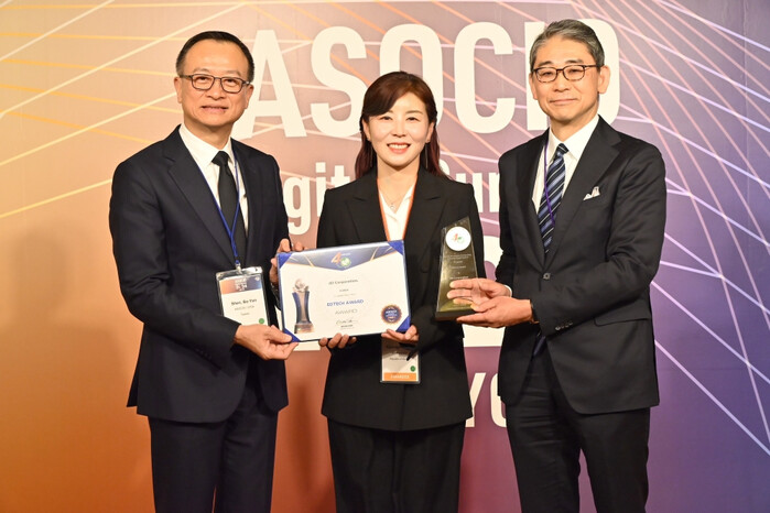 | ▲ (왼쪽부터) Brian Shen ASOCIO 회장, 이경민 재능교육 디자인센터장, Fukunaga Tetsuya JISA 회장이 수상 기념 촬영을 하고 있다.(사진=재능교육 제공) |