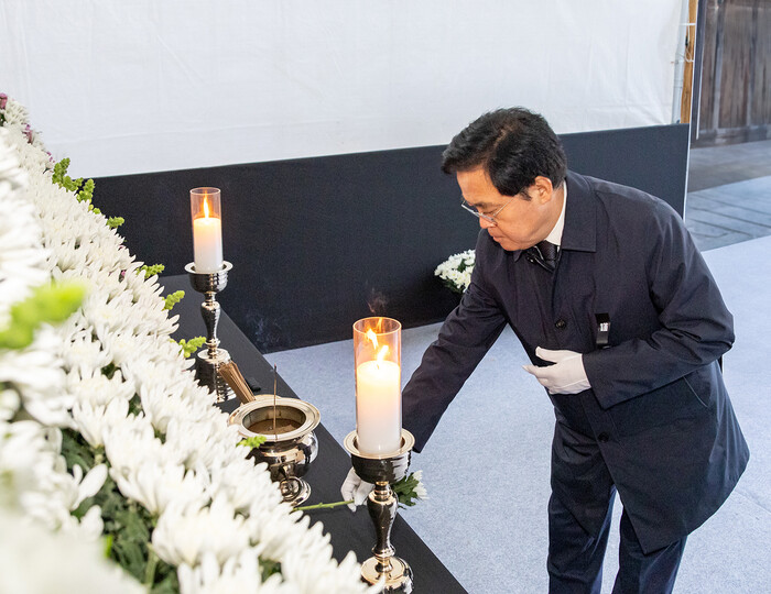 | ▲ 진교훈 구청장이 강서구청 앞마당에 마련된 ‘항공참사 희생자 합동분향소’를 찾아 조문하고 있다. (사진=강서구청 제공) |