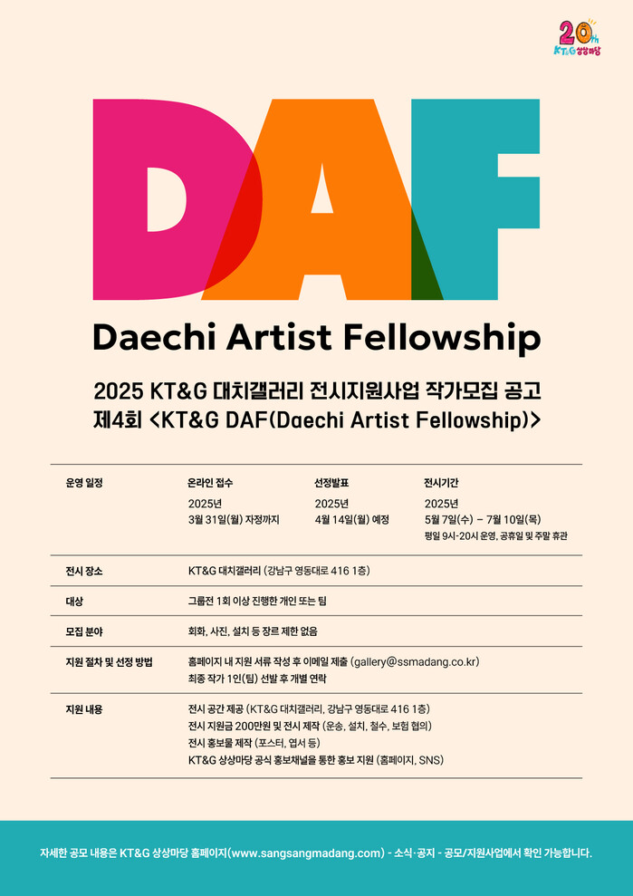 KT&G 상상마당 관계자는 “‘KT&G DAF’는 신진 작가들이 보다 넓은 대중과 소통하고, 창작 활동을 이어갈 수 있도록 실질적인 지원을 제공하는 프로그램이다”며 “앞으로도 다양한 문화예술 지원 사업을 통해 한국 예술 산업의 발전에 기여하겠다”고 밝혔다.