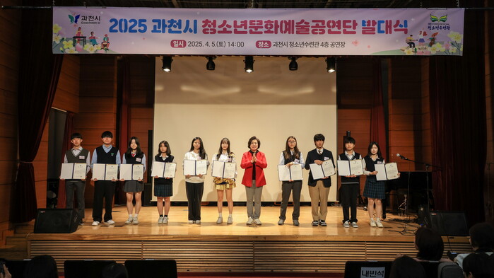 경기 과천청소년문화의집에서는 지난 5일 ‘2025년 청소년 자치조직 연합발대식’이 열려, 본격적인 청소년 자치활동의 시작을 알렸다. 이날 행사는 청소년 자치조직 소속 청소년과 동아리 회원 등 50여명이 참석한 가운데, 축하공연과 위촉장 수여, 자치조직 소개 등의 순서로 진행됐다. 사진은 신계용 과천시장(왼쪽 일곱 번째)이 참석자들과 기념촬영을 하고 있는 모습. (사진=과천시청 제공)