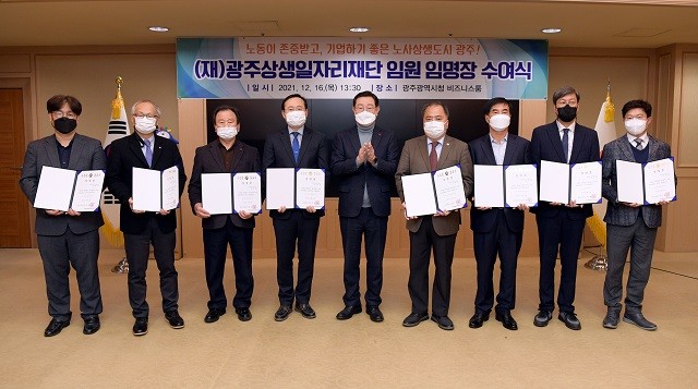광주시는 16일 오후 시청 비즈니스룸에서 지난 10월부터 임원 공모와 임원추천위원회 심사 절차를 통해 선발된 광주상생일자리재단 대표이사 등 선임직 임원 9명에 대해 임명장을 수여했다.