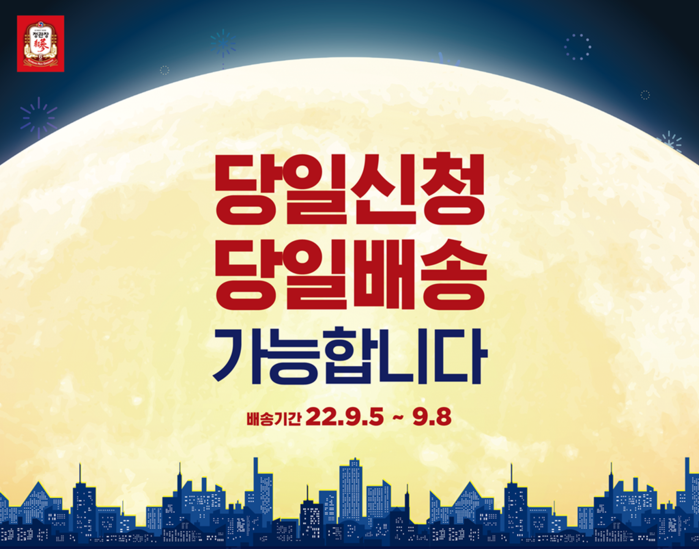 [시민일보 = 이대우 기자] KGC인삼공사는 8년만에 찾아온 이른 추석을 앞두고 정관장 제품을 구매하면 당일 배송하는 ‘당일신청·당일배송’ 서비스를 5일부터 오는 8일 정오까지 진행한다고 밝혔다.