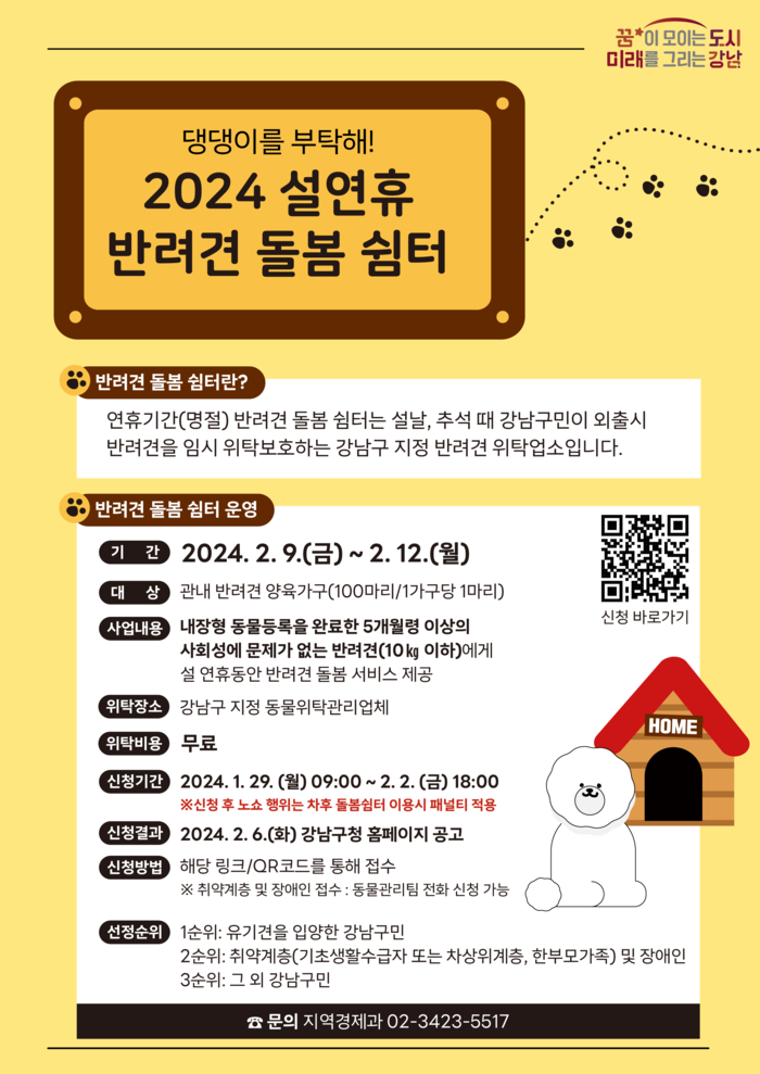 구는 이번 설 명절부터 반려견 쉼터 운영을 시작해 고향 방문과 여행 등으로 반려견과 함께 할 수 없는 구민을 지원할 계획으로, 오는 2월2일까지 신청 접수를 받는다.