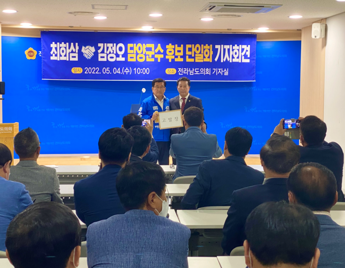 4일 오전 10시 이들은 전라남도의회 브리핑실에서 기자회견을 열고 이번 담양군수 선거는 불법과 탈법, 반칙이 난무한 경선으로 당과 담양의 이미지가 크게 후퇴시켰다며 최화삼, 김정오는 단일화를 통해 군민의 심판을 받겠다고 선언했다.