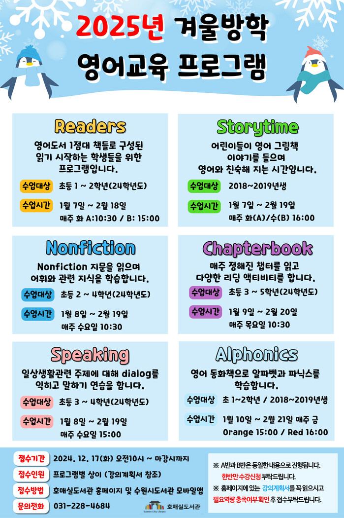 [수원=임종인 기자] 경기 수원시 호매실도서관이 17일부터 ‘겨울방학 영어교육 프로그램’에 참가할 어린이, 초등학생을 모집한다.