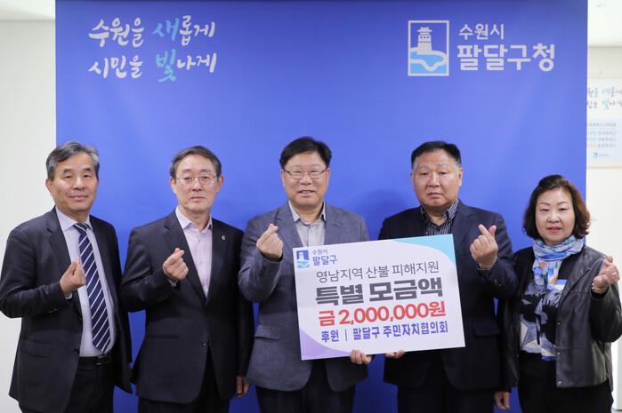 경기 수원시 팔달구 주민자치협의회가 7일, 영남지역 산불피해 지원을 위한 특별모금액 200만원을 경기 사회복지공동모금회로 기탁했다. 전달된 모금은 경기 사회복지공동모금회에 기탁돼, 울산 울주군, 경북 의성군, 경남 산청군, 하동군 등 특별재난지역의 산불 피해 지원에 사용될 예정이다. 사진은 기탁식에 참석한 이상균 구청장(가운데)이 참석자들과 기념촬영을 하고 있는 모습. (사진=팔달구청 제공)