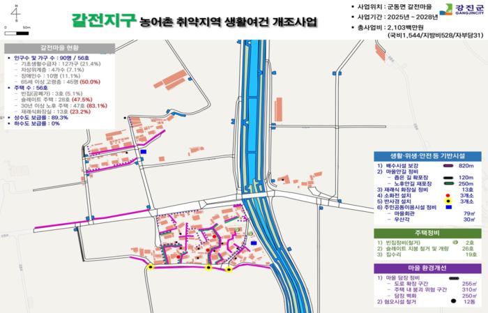 이를 통해 군은 2개 마을에 2025년부터 2028년까지 4년에 걸쳐 마을회관 리모델링, 마을 안길 및 배수로 정비, 집수리 등 다양한 사업을 추진해 편리하고 쾌적한 마을로 새롭게 조성할 계획이다.