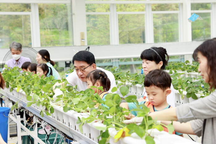 문헌일 서울 구로구청장이 최근 딸기 모종 심기 체험 행사에 참석한 가운데 어린이집 원아 13명과 함께 스마트팜 주요 시설을 견학하고 스마트 온실에서 딸기 모종을 심었다. 사진은 문헌일 구청장이 원아들과 함께 딸기 모종을 심고 있는 모습. (사진=구로구청 제공)