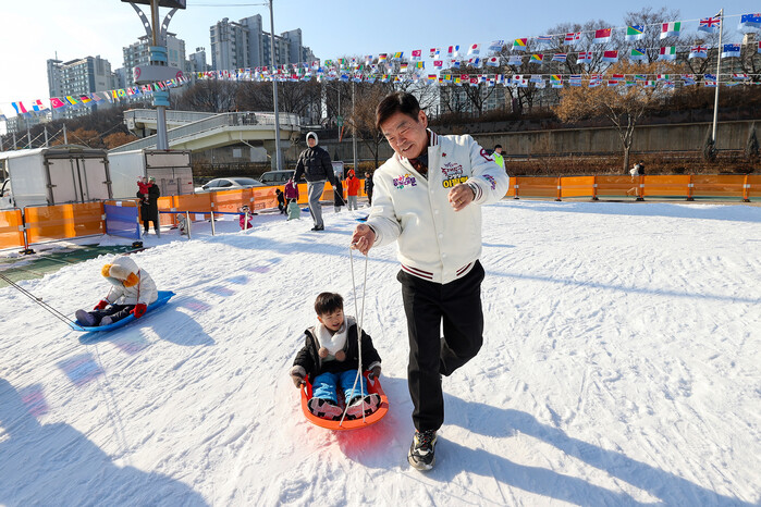 | ▲ 눈썰매장을 방문한 이필형 구청장이 한 아동의 눈썰매를 끌며 즐거운 시간을 보내고 있다. (사진=동대문구청 제공) |